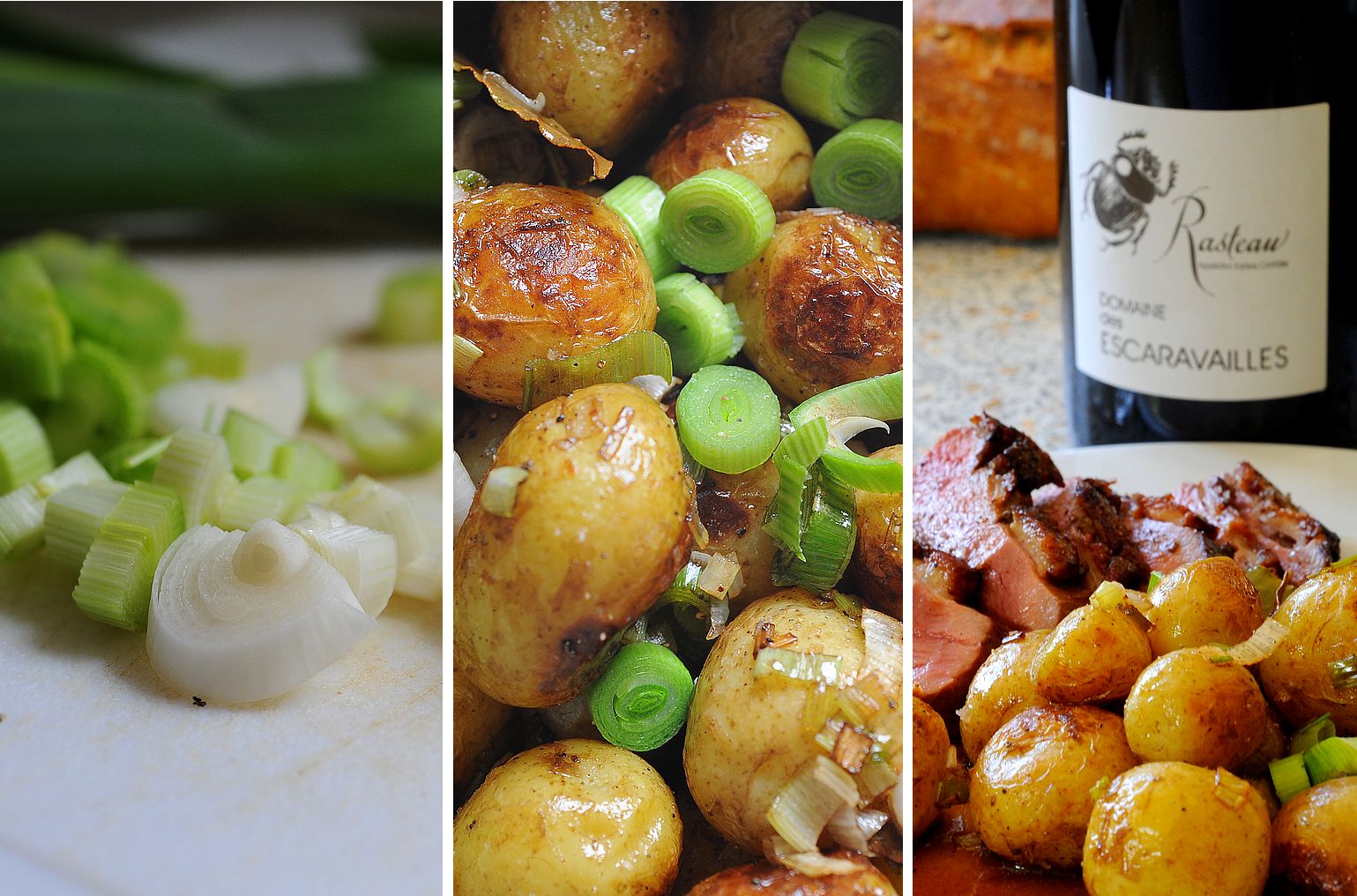 La grenaille, après avoir lavé les patates, cuisson 2mn à la vapeur, puis on met à dorer dans un peu de graisse avec du laurier frais, en fin de cuison on ajoutes l'ail grossièrement tranché, le blanc et le vert ! Poivre du moulin et fleur de sel.
